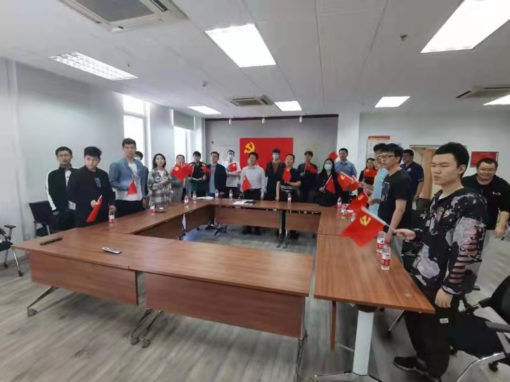 会议开始,全体党员合唱《没有共产党就没有新中国》,全体与会人员跟随者歌曲的旋律,挥舞着手中的党旗,激情澎湃,斗志昂扬。