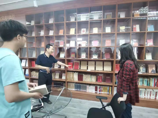 会议开始前,金军带领党员同志们参观图书馆党建工作室新设立的板块,每个板块都陈列了不同的馆藏图书,其中不乏珍贵的孤本,例如老一辈科学家的入党申请书,彭士禄院士捐赠的党史书籍等。金军还代表图书馆党总支向徐特立学院赠送了两套珍贵党建图书,供党员同志们交流学习使用。