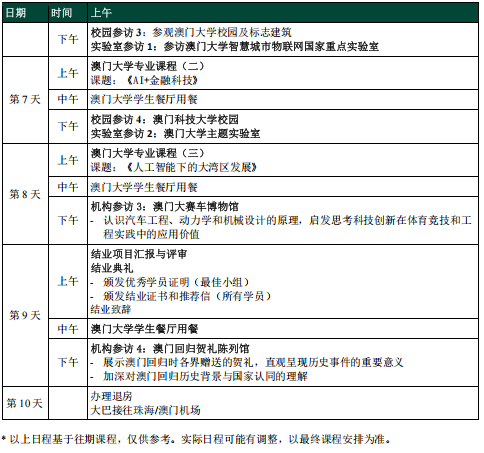学术与实践并重的课程体系。课程内容涵盖前沿学术探索、跨学科交叉研究以及实践应用环节,着力培养学生的全球视野、学术素养与跨文化交流能力。项目设有结业展示,鼓励学生在学术与实践结合中提升综合能力。顺利完成项目后,香港大学主办部门将为每位学员颁发项目结业证明信;澳门大学主办部门将为每位学员颁发结业证书、项目推荐信、成绩单和学时证明,结业展示中获得优胜的小组成员还将获得优秀学员证明。